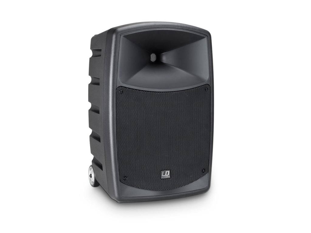 Díky zabudovaným kolečkům a teleskopické rukojeti se reprobox snadno převáží a na vrchním panelu zbyl také prostor pro uložení až dvou bezdrátových mikrofonů.rofonem: LDRBUD10B6
