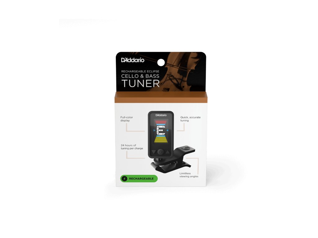 Ladička Eclipse od společnosti D'Addario je jednou z nejoblíbenějších ladiček této značky. Model PW-CT-28, určený speciálně pro violoncello a kontrabas, je nabíjecí a na jedno nabití vydrží až 24 hodin ladění. K nabíjení slouží USB-C kabel, který je součástí balení. Ladička dále vyniká barevným otočným displejem, který je krásně čitelný a přehledný. Nabízí také kalibraci tónu od 430 do 450 Hz a díky automatickému vypínání šetří baterku. Pro nejlepší přesnost je doporučeno ladičku připevnit na kobylku v blízkosti basových strun.