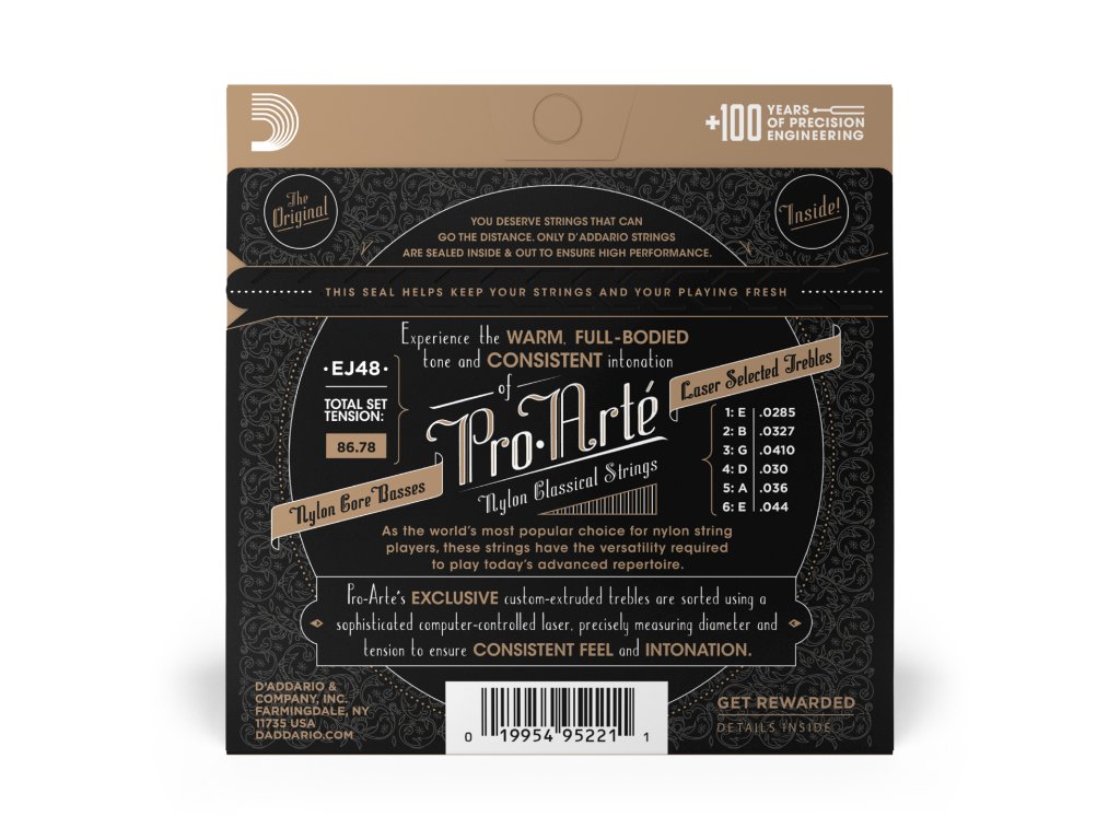 Pro-Arté, the world's most popular classical strings are D'Addario's premium classical guitar string sets. All Pro-Arté treble strings are sorted by a sophisticated computer-controlled laser machine which performs diameter and tension measurements, ensuring true-sounding, precise trebles in every set. Pro-Arté basses are wound using silver-plated copper on a multi-filament nylon core for consistent and warm, yet projecting tone.Doplňkové parametry
