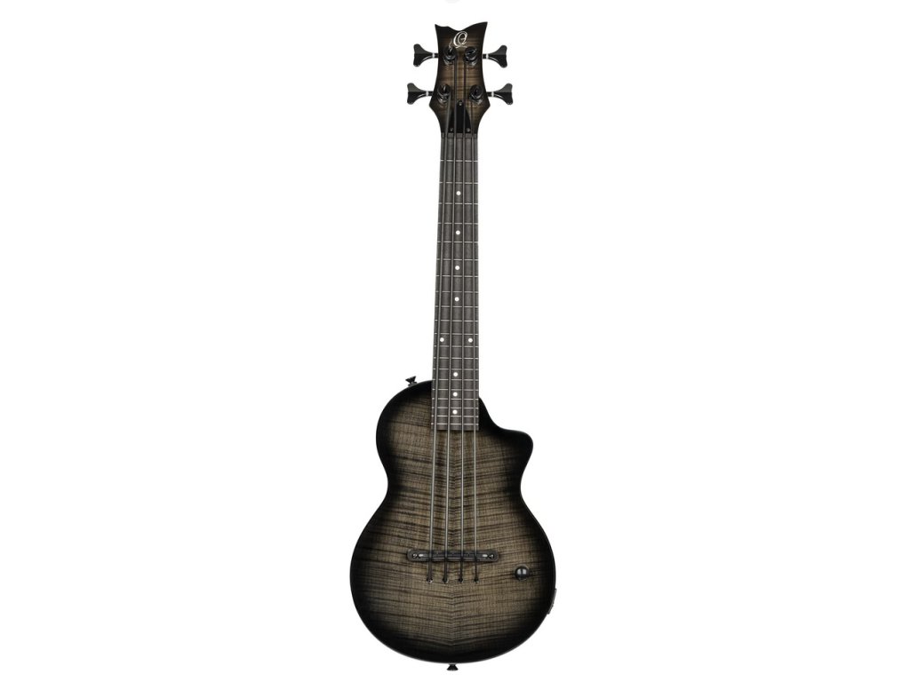 Tělo basového ukulele Ortega Neo BS TGB je zhotoveno z masivu okoumé a topu z fládrovaného javoru. Kresbu fládrovaného javoru zvýrazňuje lesklý lak a barevná úprava Transparent Grey Burst. K javorovému krku je přilepen hmatník ze dřeva purpleheart osazený dvaceti pražci. Dohmat na vyšších polohách hmatníku usnadňuje spodní výřez těla.